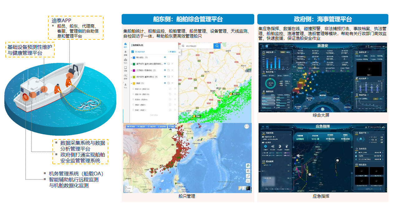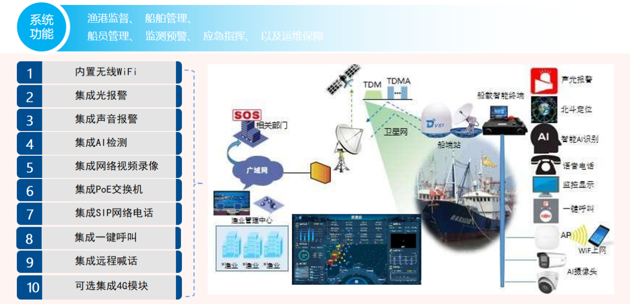 本案例使用場景是在海上的漁船,主要解決客戶海上通訊、上網、以及數據的回傳(視頻監控,位置信息,航行軌跡、報警信息等)等需求,使漁業管理部門實現對漁船的有效監管,在船舶遇到險情的時候可以一鍵報警,快速救援,保證漁船作業安全。